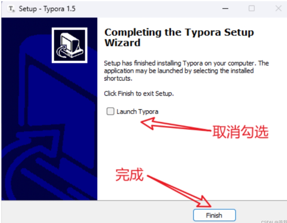 安装完成后,取消勾选 “Launch Typora”,然后点击 “Finish” 退出安装界面。