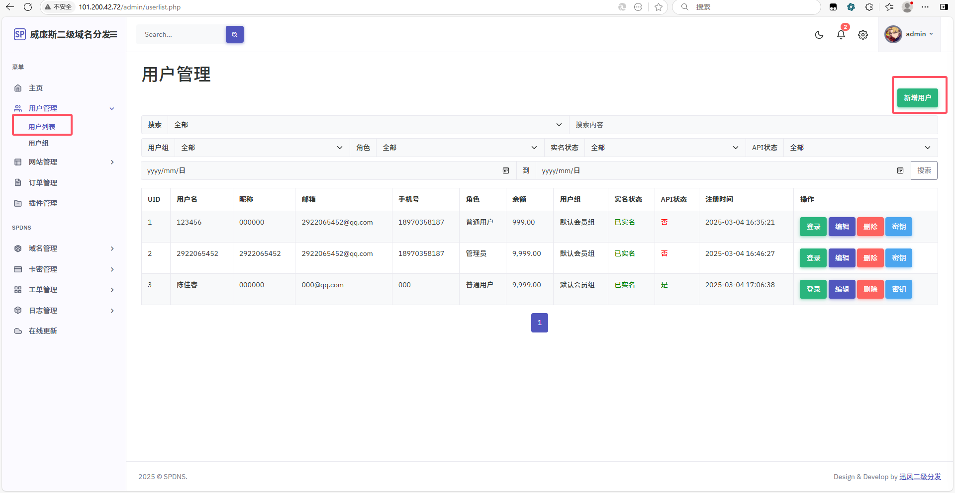 因为没有配置短信接口和邮箱接口,而且无法关闭注册验证,只能管理员注册用户,记得添加用户时添加余额(没有添加支付接口)