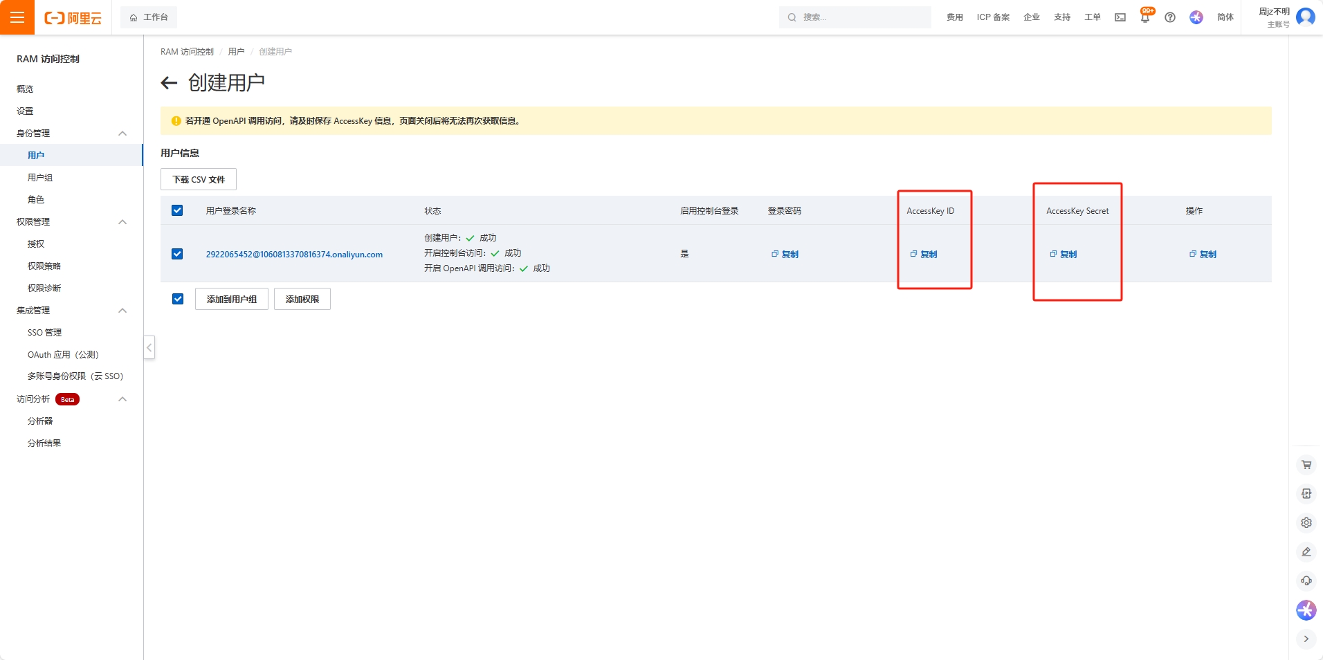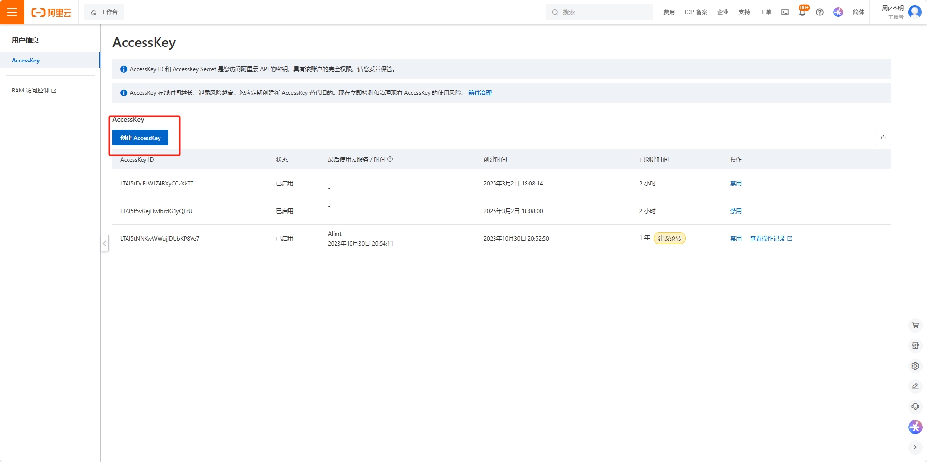 将红框中的AccessKey Id和AccessKey secret复制出来保存好,配置PicGo时要用到