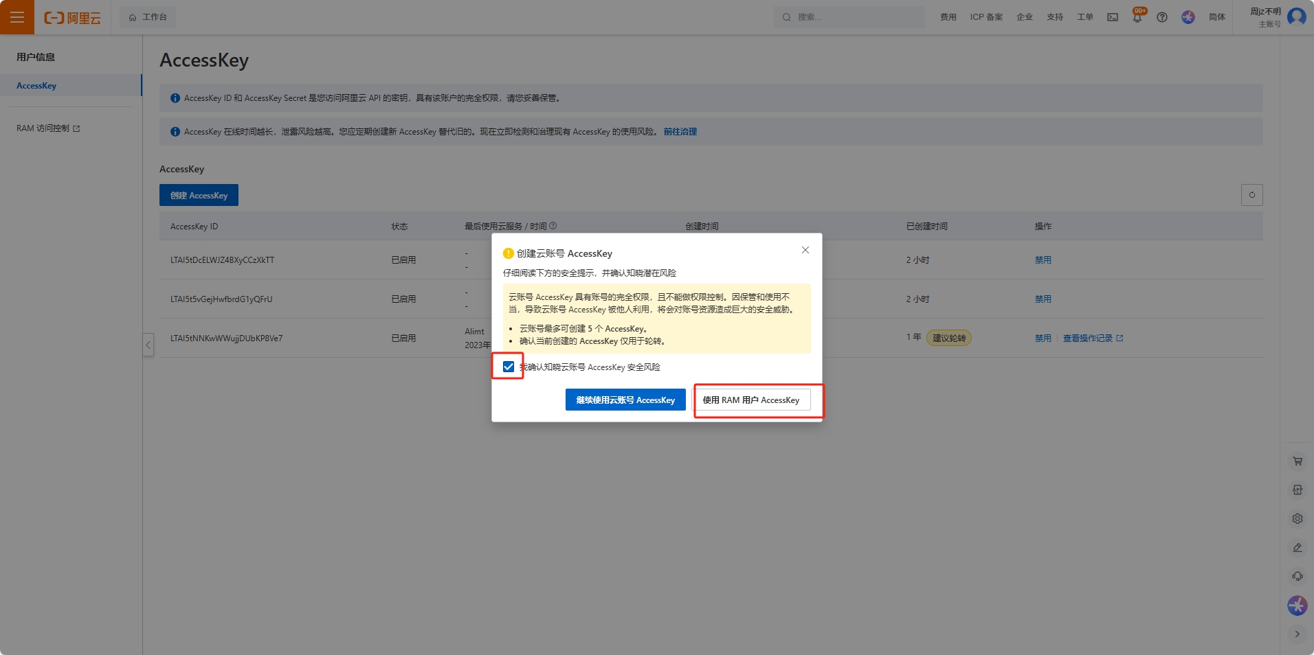 点击创建 AccessKey,再点击开始使用子用户 AccessKey