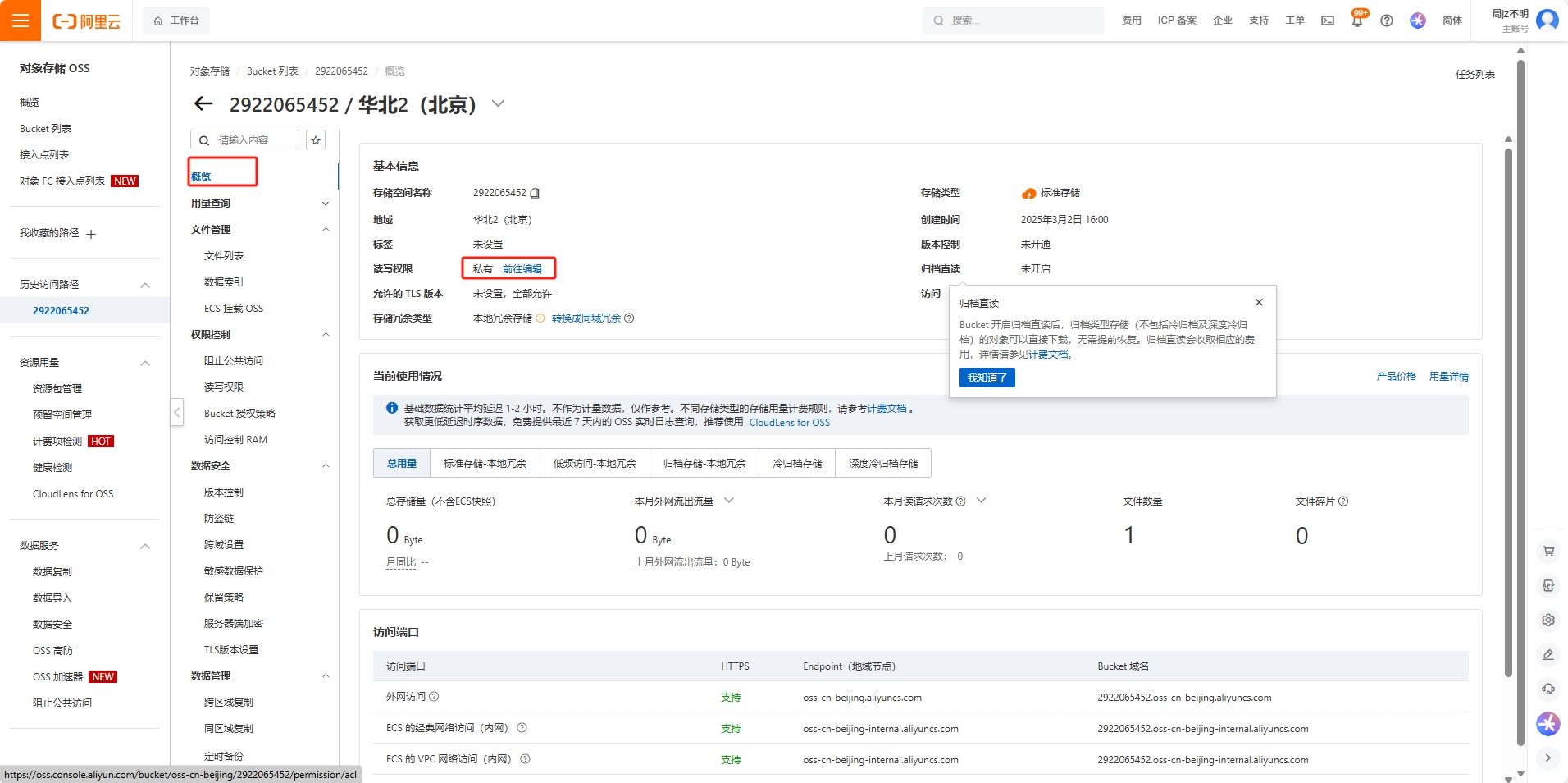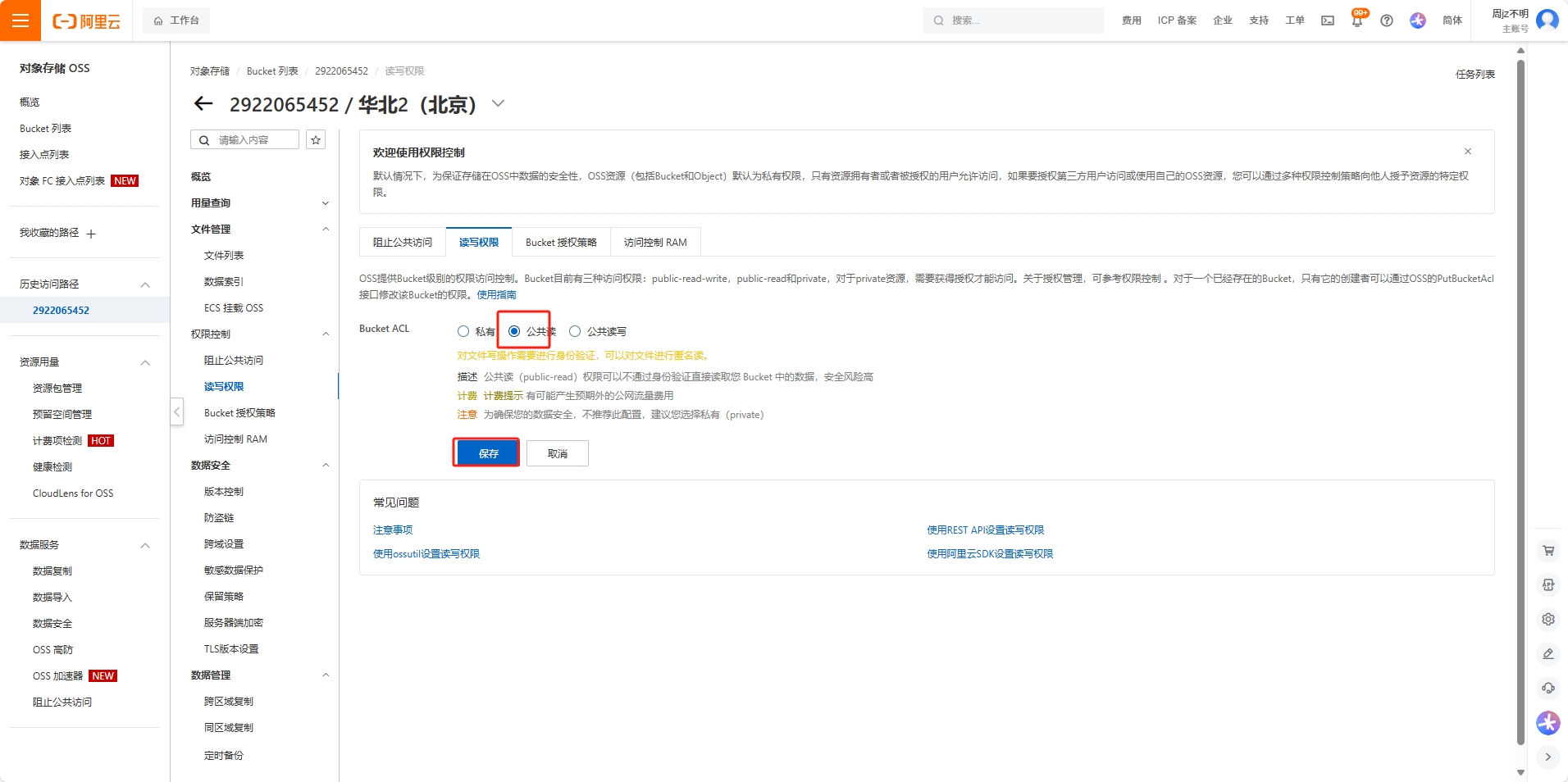因为在创建时设置不了公共读,只能设置私有,如果是私有,那么我们在外部无法访问。我们现在要将私有改成公共读