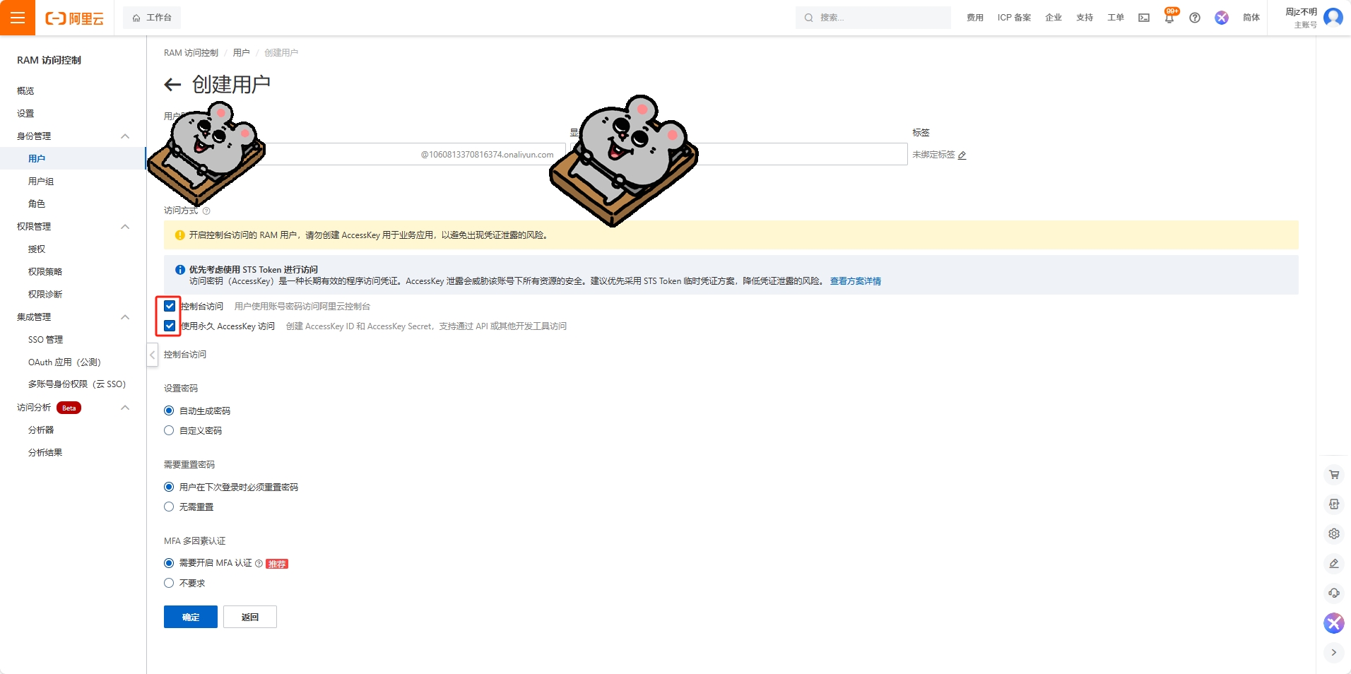 填写好登录名称,显示名称,勾选控制台访问,OpenAPI调用访问,其他选择默认就好,点击确认,在弹出的安全验证中选择一种方式完成验证