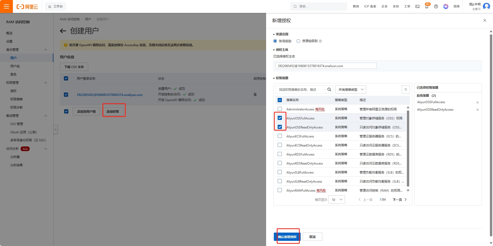 重要!上面生成的AccessKey是主账户的,它也可以用来配置picgo,但是如果我们只是需要使用OSS,强烈建议使用子账号来访问这个Bucket,这样可以规避主账户AccessKey或者密码泄露导致的问题。步骤如下: